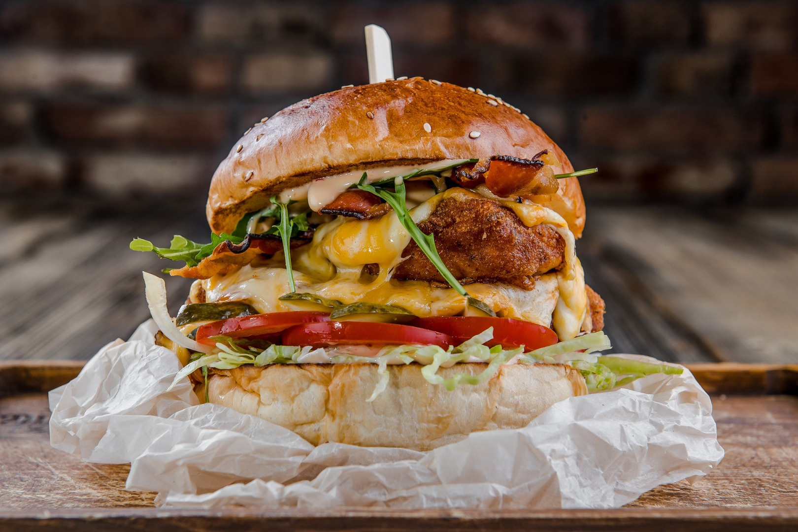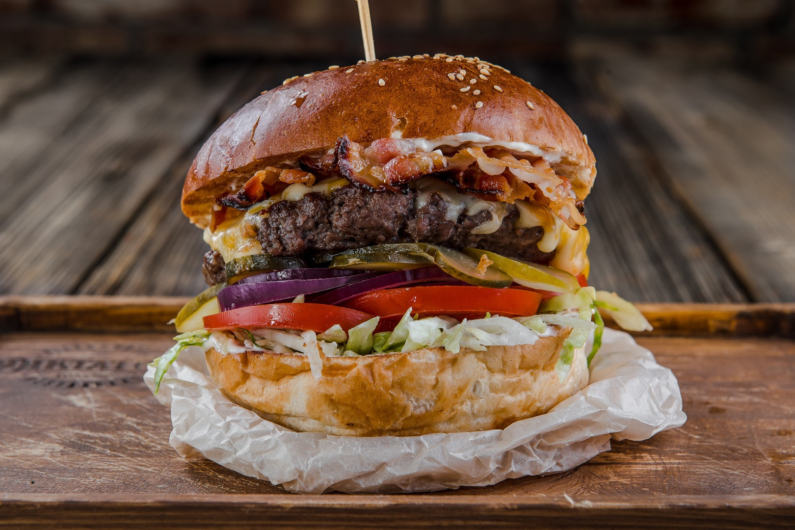 180g 100% odležaný hovädzí chuck roll, domáca majonéza, 2x syr (cheddar, eidam), slaninový chips, zelený šalát, nakladaná uhorka, červená cibuľa, paradajka