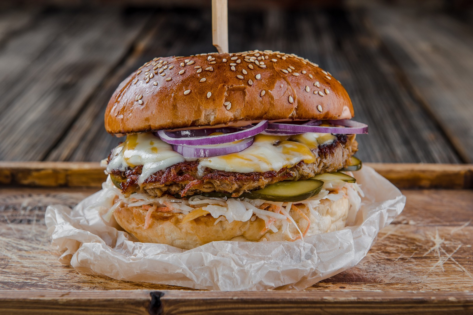 170g trhané bravčové mäso, BBQ majonéza, 2x syr (cheddar, eidam), coleslaw šalát, slaninový chips, nakladaná uhorka, červená cibuľa