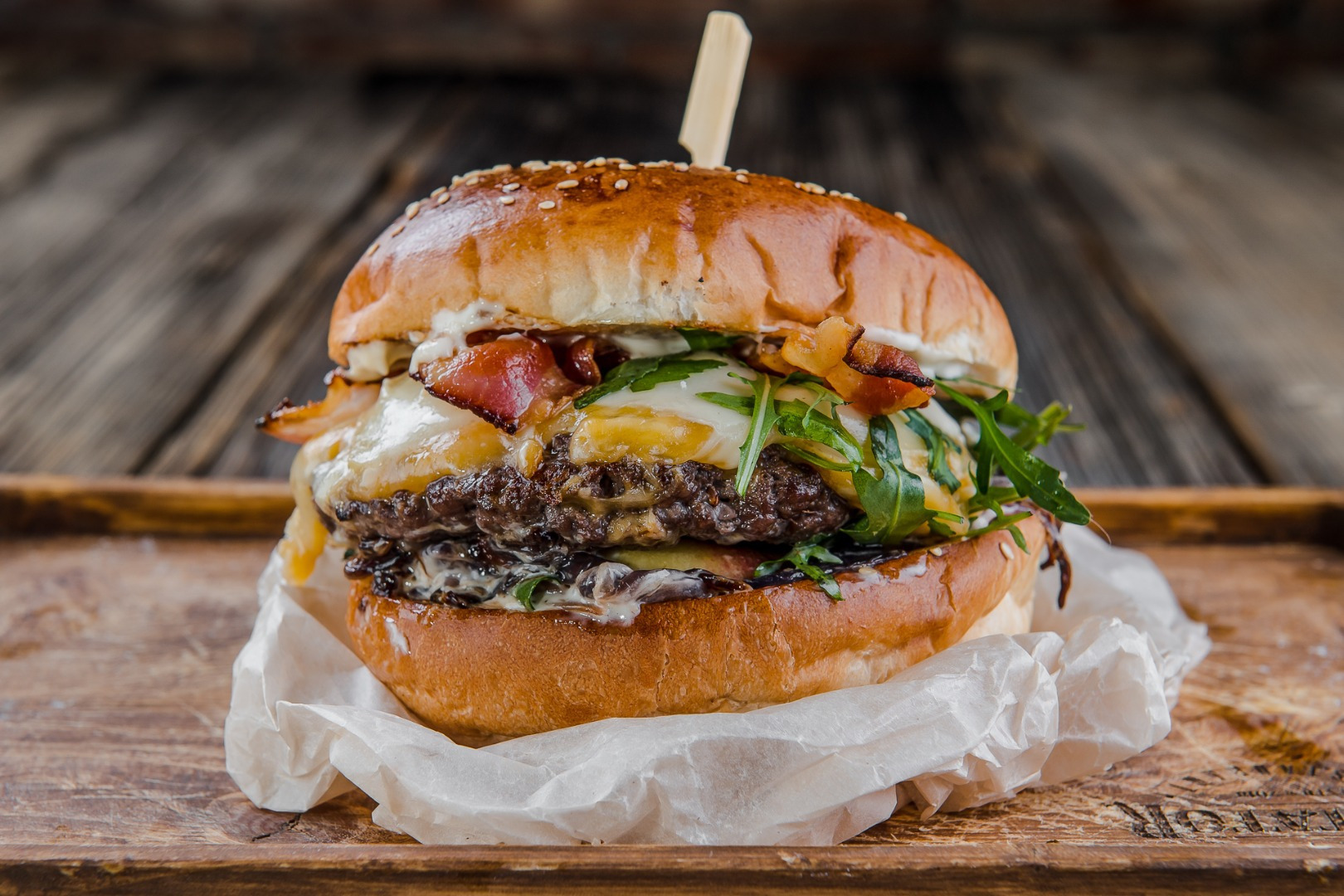 180g 100% odležaný hovädzí chuck roll, hľúzovková majonéza, 3x syr (cheddar, eidam, volovec), slaninový chips, restovaná cibuľa, rukola