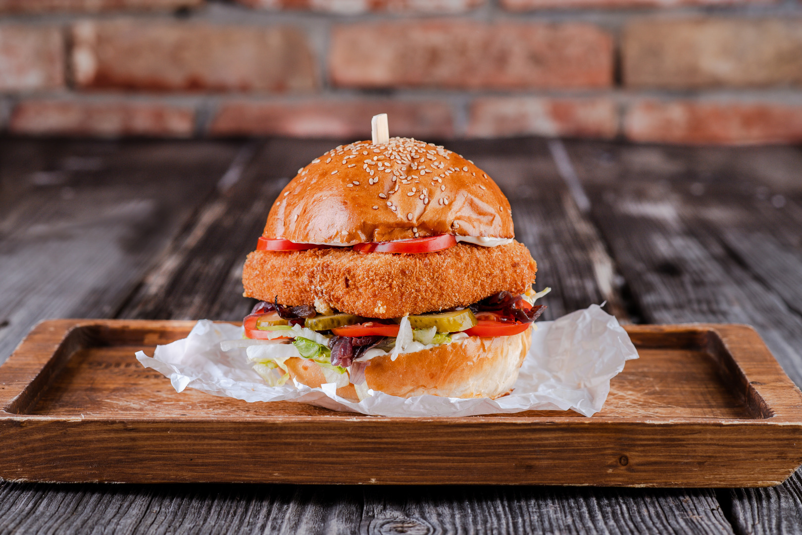 140g vyprážaný cheddar/eidam v panko strúhanke, hľuzovková majonéza, paradajka, restovaná cibuľa, zelený šalát, kyslá uhorka